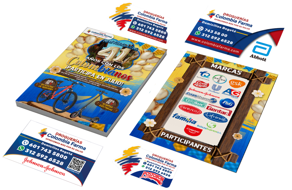 Implementación de material publicitario para la campaña nacional de aniversario en todos los puntos de venta Colombia Farma, con enfoque en la compra de marcas patrocinadoras para la participación en la rifa de los premios estipulados durante el mes.